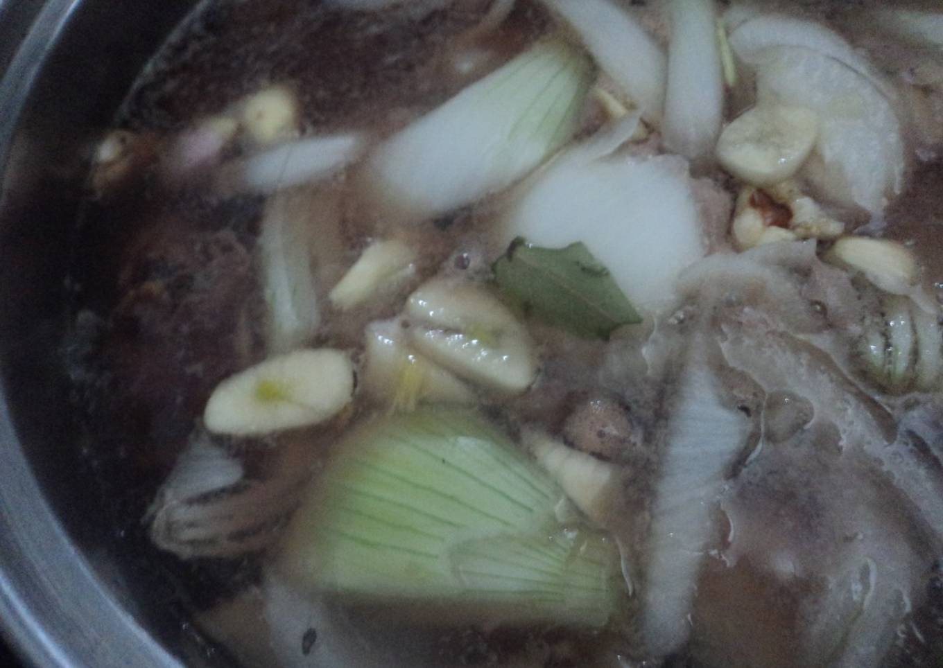 - Se pone a hervir todo en una olla grande a fuego muy bajo en las brasas durante cinco horas, mezclando todo de vez en cuando con cuchara de palo para que no se pegue, nunca poner sal al inicio se hacen duros los hígados, casi al final poner sal de mar o grano, reposar y servir caliente.