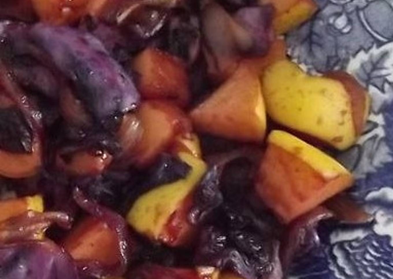 - En una cazuela de barro honda calentamos la manteca, al humear sofreír la cebolla, el repollo, la manzana y sal, al dorarse un poco agregar el café, el piloncillo y el anís estrella, dejar reducir.