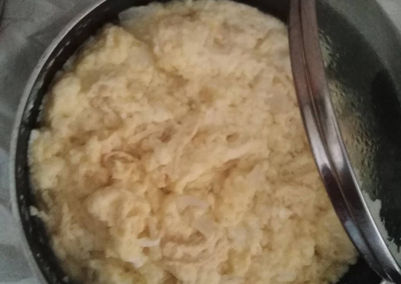 - Batir los huevos agregar 1/2 cebolla picada finamente, agregar sal y la pechuga desmenuzada y revolver todo