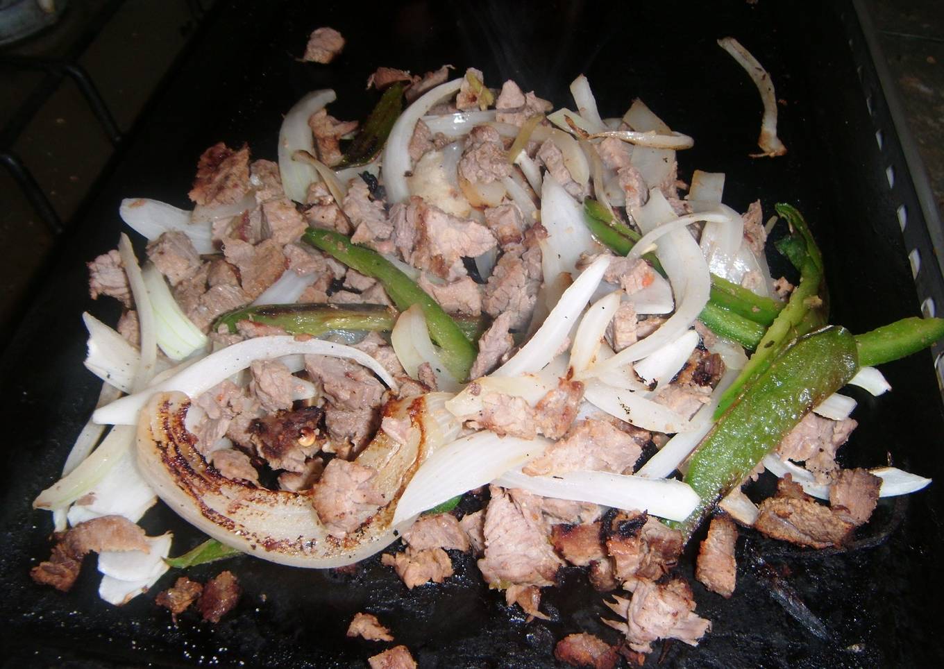 - En el comal vamos a poner a cocer la carne unos minutos; a medio dorada el kilo de carne de Bisteck vamos a agregar ell chile morrón, y las cebollas perfectamente cortadas, se les agrega el jugo del limon, ya cocida la carne se pica.