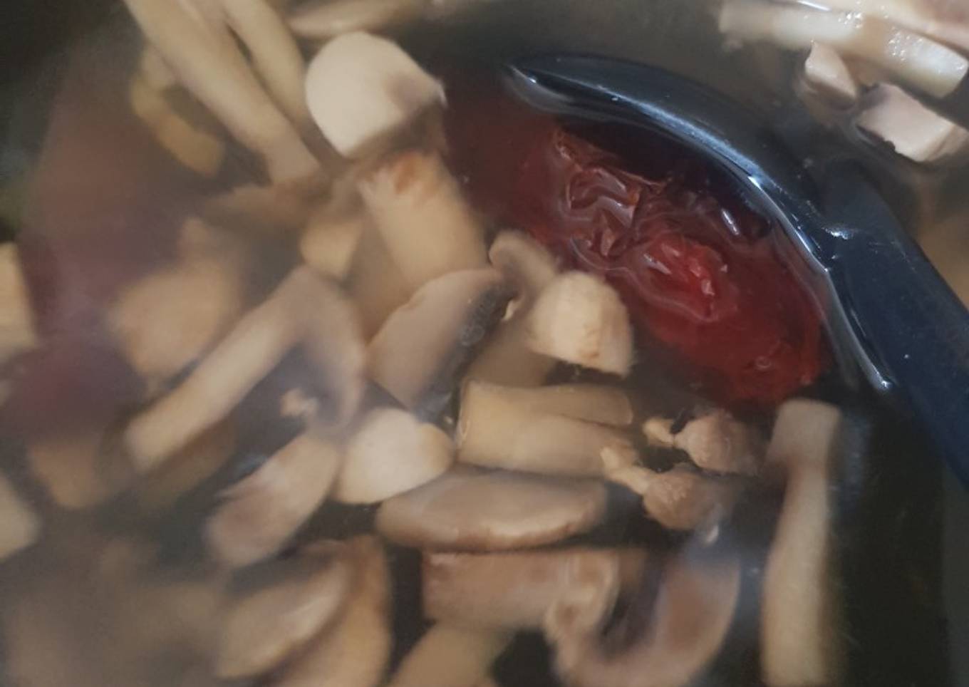 - Dejamos que empiece a hervir y agregamos los champiñones. Dejamos que el agua se consuma y quedé un caldo color café.