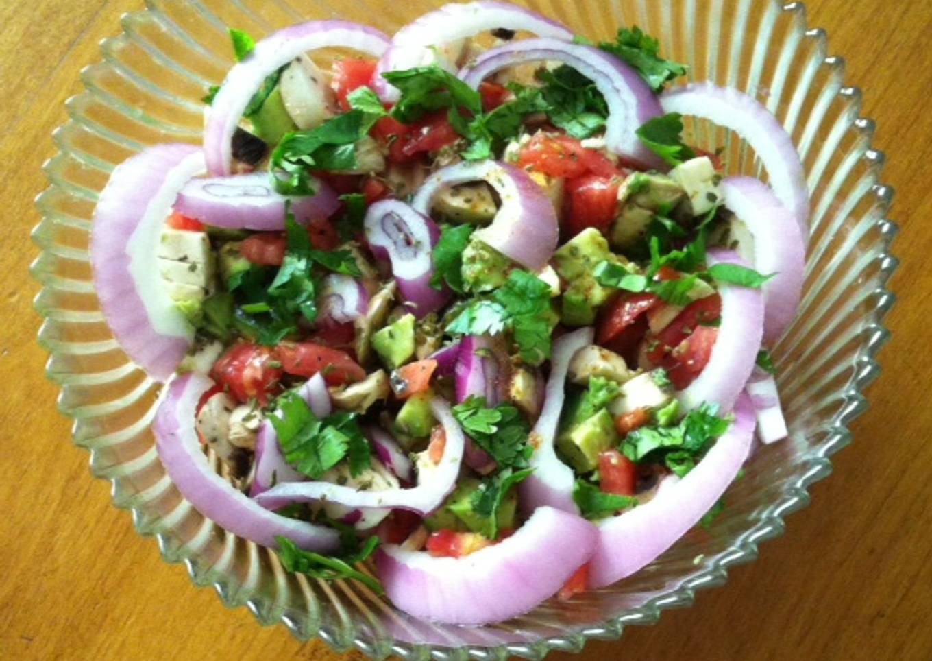 - Necesitamos lavar y picar 5 champignons grandes, pelamos y picamos un aguacate, uno o dos jitomates pelados y picados, cilantro picado, un diente de ajo también picado finamente o prensado, el jugo de uno o dos limones, aceite de oliva, sal y pimienta. Se le pueden incorporar muchas otras cosas como pepino picado, granitos de elote, queso mozzarella, un chile serrano sin venas ni semillas picado finamente, etc. eso es al gusto. Por último lo adornamos con unas tiras de cebolla morada.