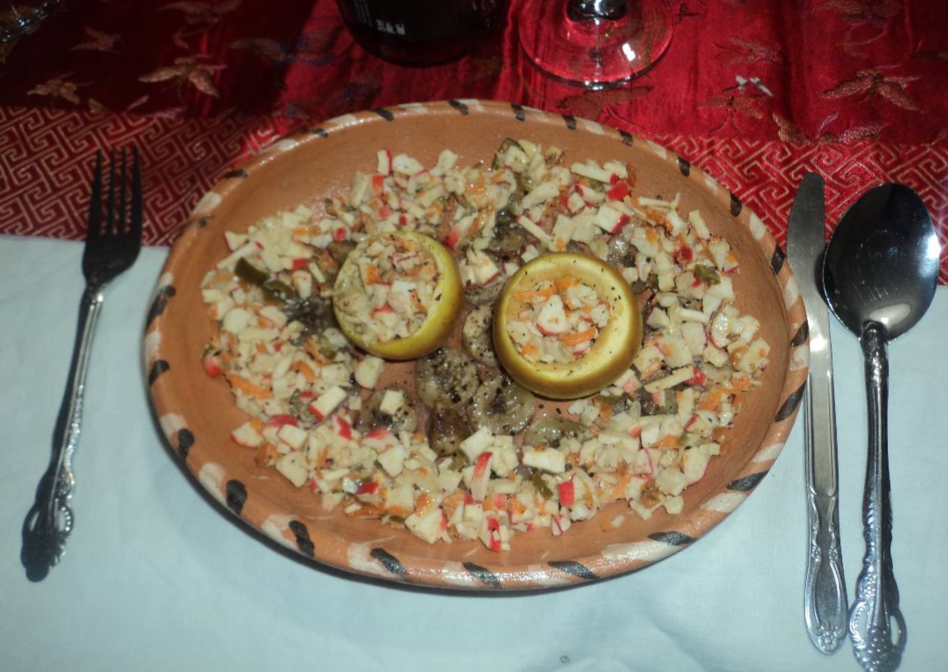 Manzanas horneadas rellenas de ensalada de surimi y plátano con tequila