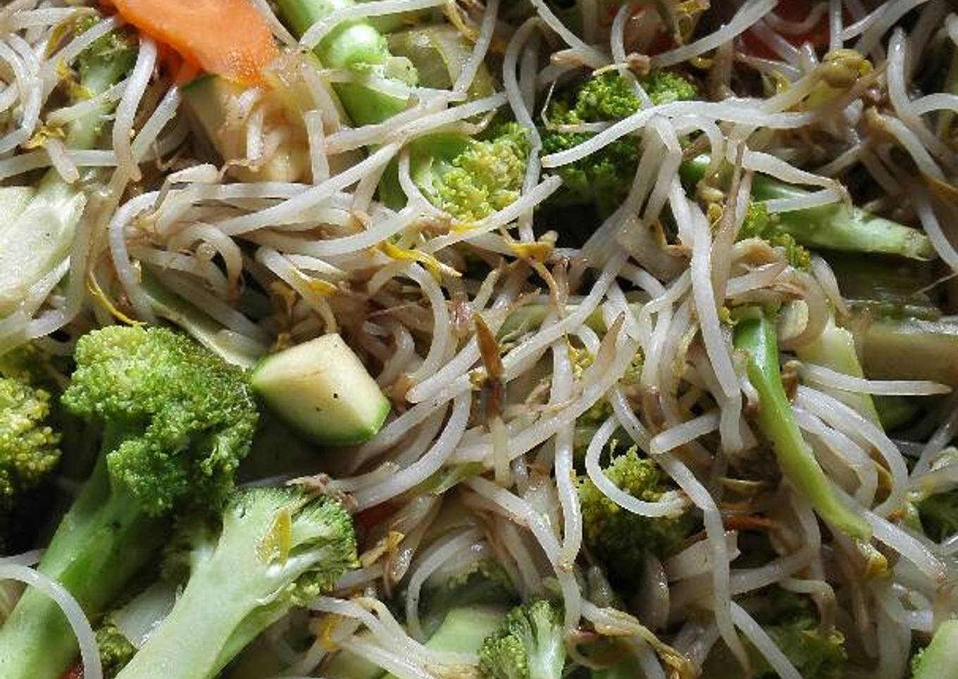 - En una cacerola ponemos el la cebolla, apio y zanahoria, movemos y a los 5 minutos incorporar el germinado de soya y el brócoli, ir sazonando con sal, pimienta, ajo en polvo y salsa de soya conforme vayamos echando la verdura, por último agregar la calabaza, ya que esta es muy tierna y se cuece muy rápido, tapar y checar el crocante de la verdura deseado y listo, servimos con arroz. 🍚