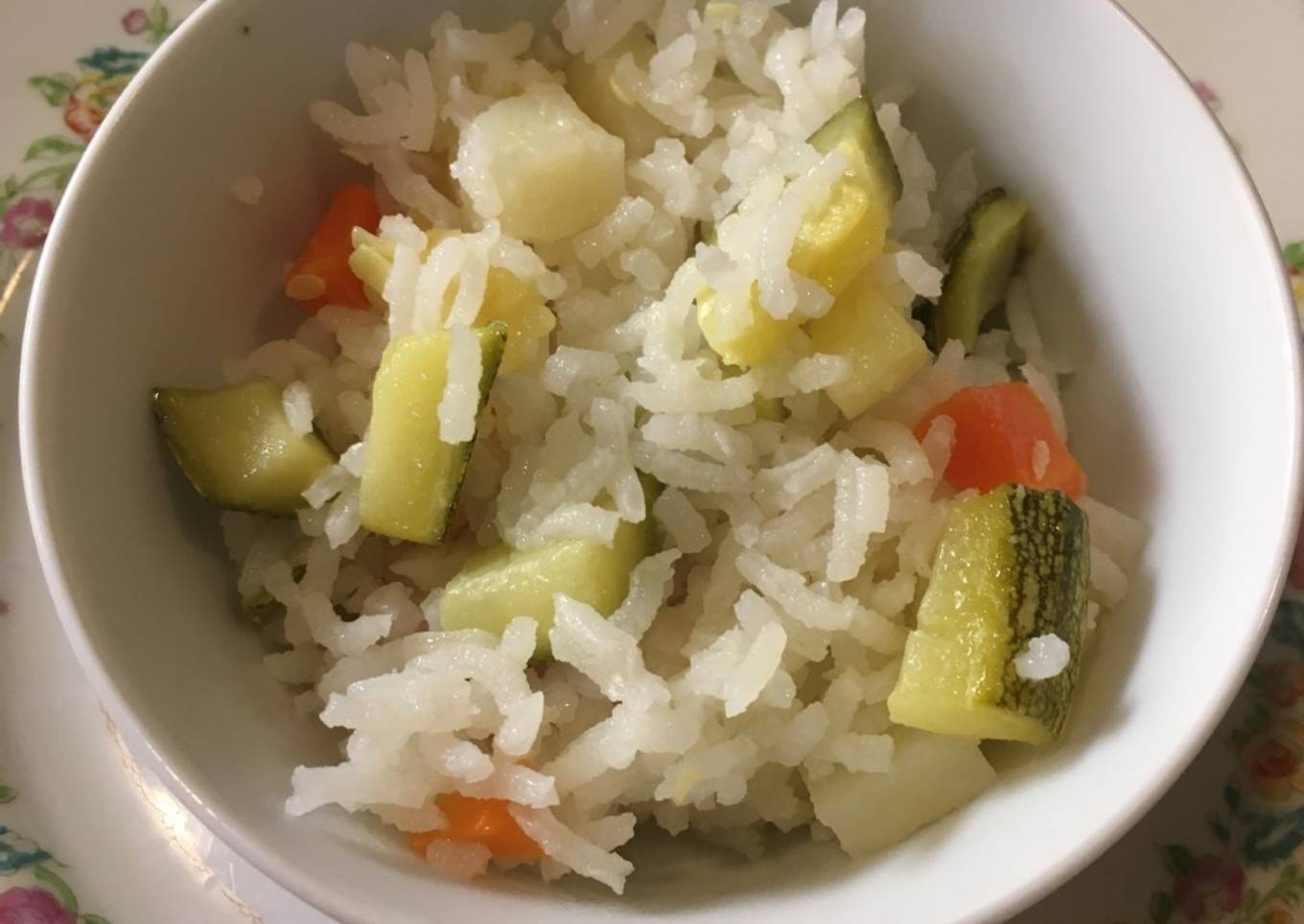 - Para hacer este arroz necesitamos remojar una taza de arroz en agua caliente al menos media hora y después lo escurrimos y lo ponemos a freír con bastante aceite agregando en ese momento 1 zanahoria pelada cortada en 4 a lo largo y después en triángulitos, una calabacita cortada en la misma forma 2 rebanadas de cebolla cortadas en 4 cada una, dos dientes de ajo y una papa pelada y cortada en cuadritos, se le pueden poner chícharos y granitos de elote.