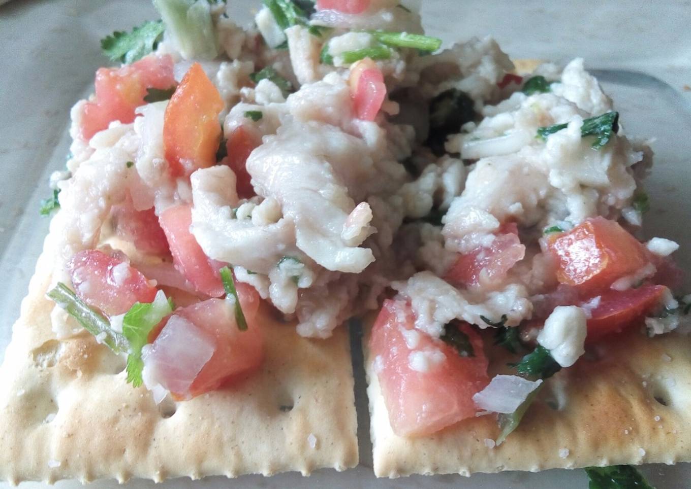 - Mezclar los ingredientes con el pescado agregando sal y aceite de olivo. Refrigerar hasta que este cueza con el limón. Aproximadamente 4/5 hrs. durante ese tiempo mezclar ocasionalmente)