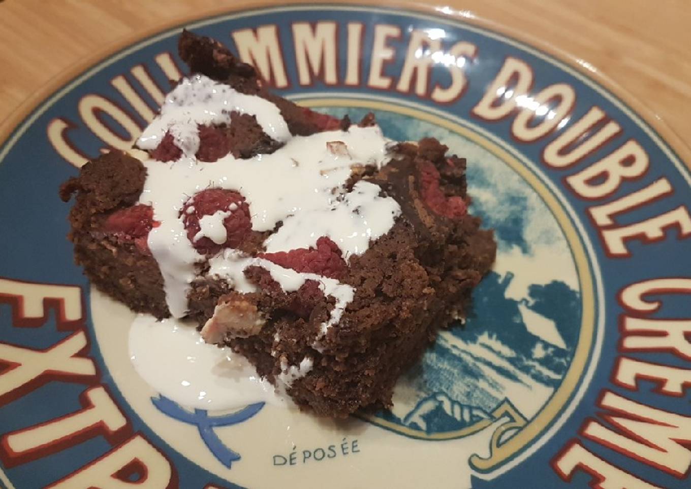 - Poner los toppings sobre la preparación para brownie, primero el queso crema, luego el chocolate picado, y terminar con las frambuesas