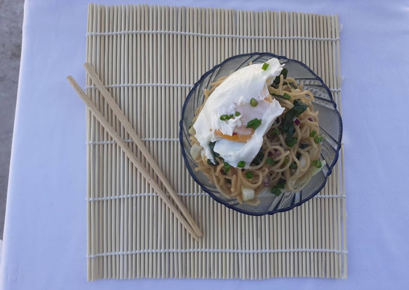 - Añadir la pasta un poco del agua de la pasta y el ajo y jengibre