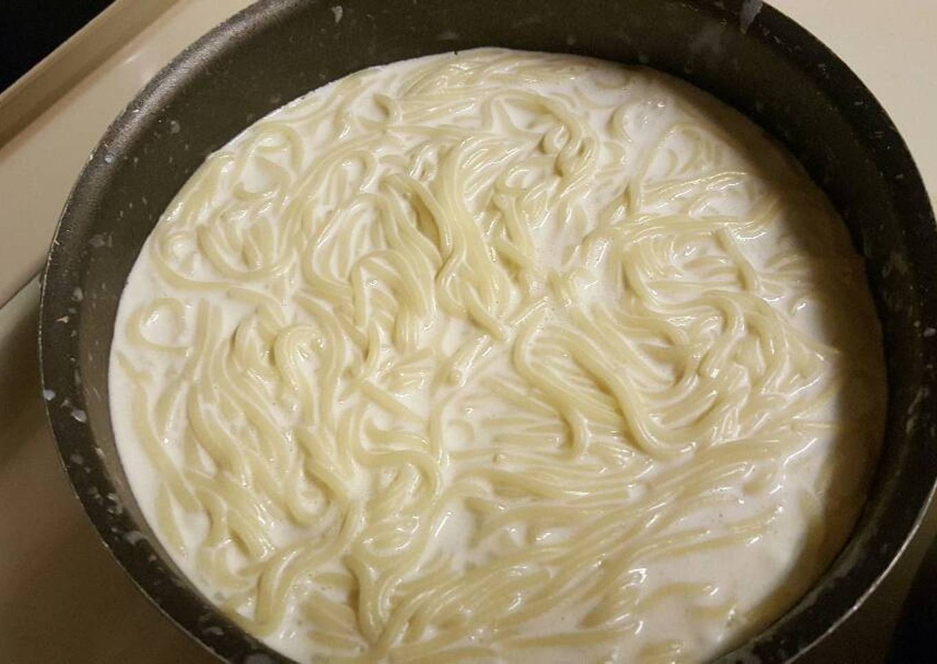 - Ahora pondremos en una cacerola onda un poco de mantequilla a derretir y luego agregamos nuestros espaguetis a freir un ratito y seguido hechamos la crema mezclada con leche y sazonamos.